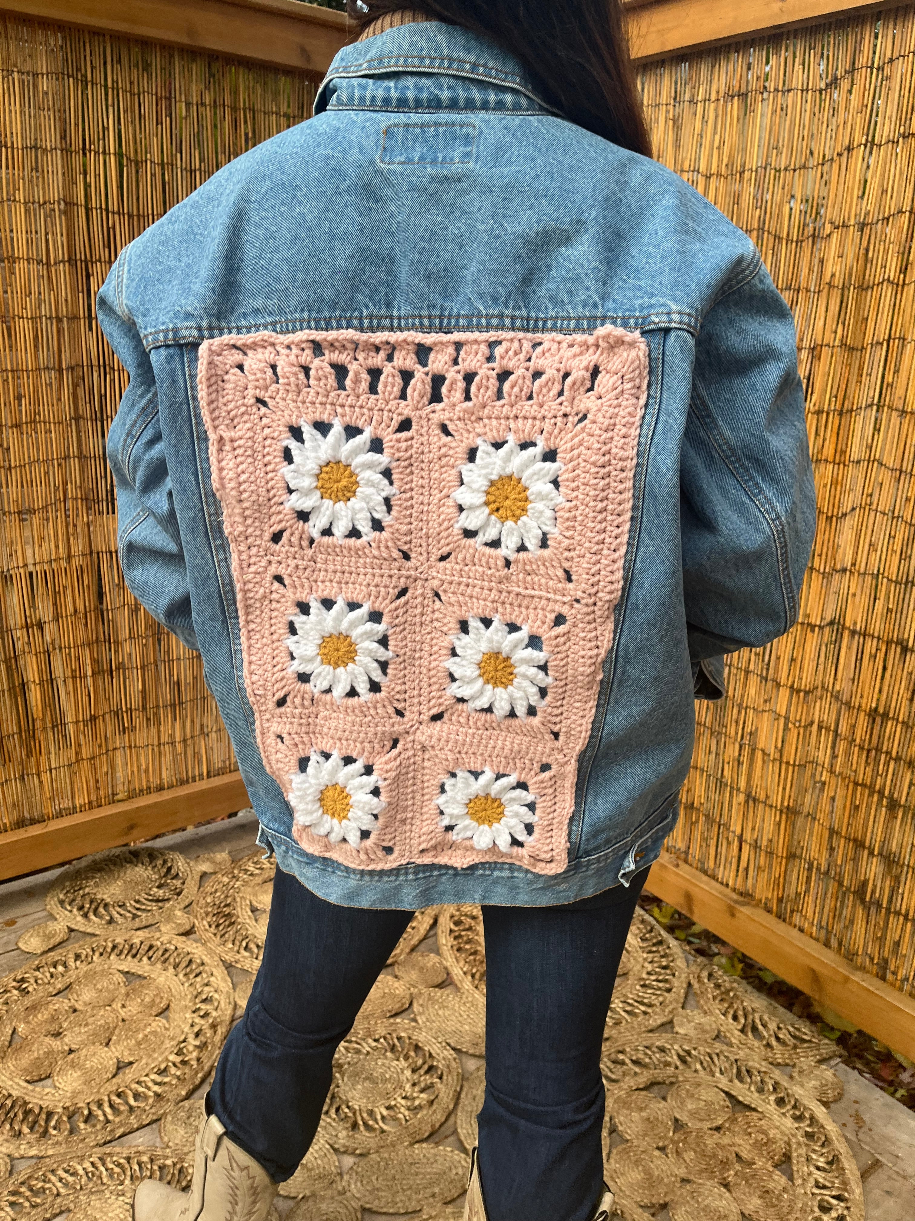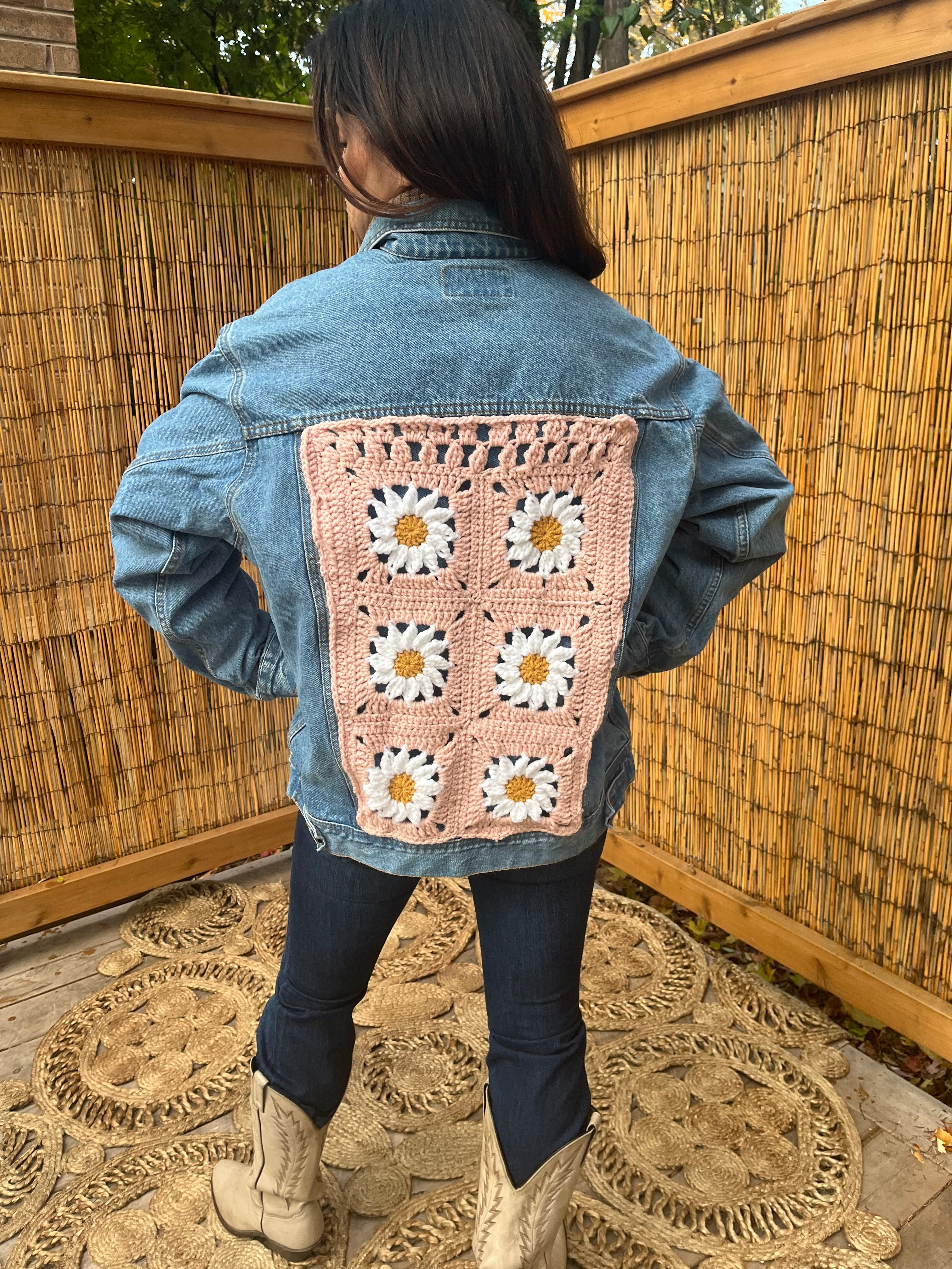 This Wrangler Denim Jacket began as a well-loved, classic blue denim piece and has been thoughtfully revived with a hand-sewn crochet back panel featuring light pink squares with white flower centers. The blend of rugged denim + soft handmade crochet creates a harmony that feels both strong and tender — a jacket with story and heart.
