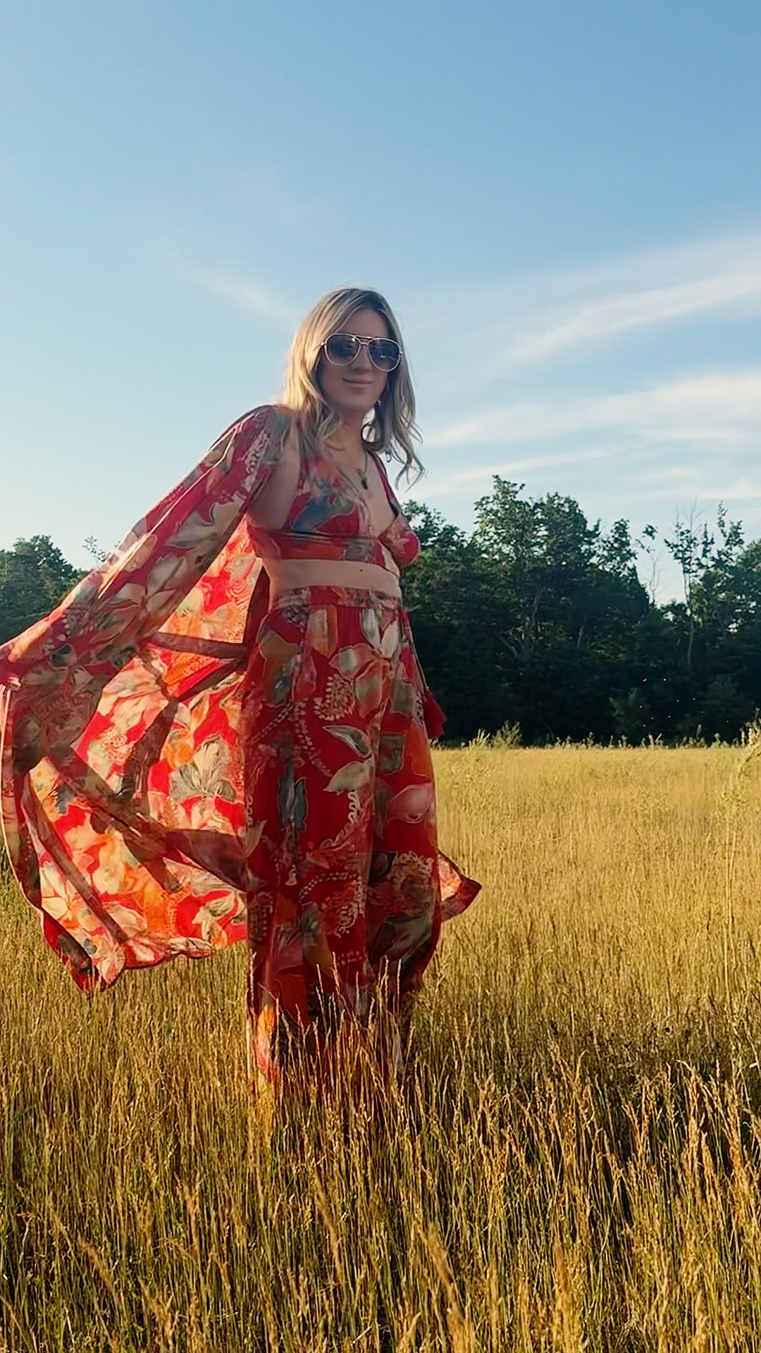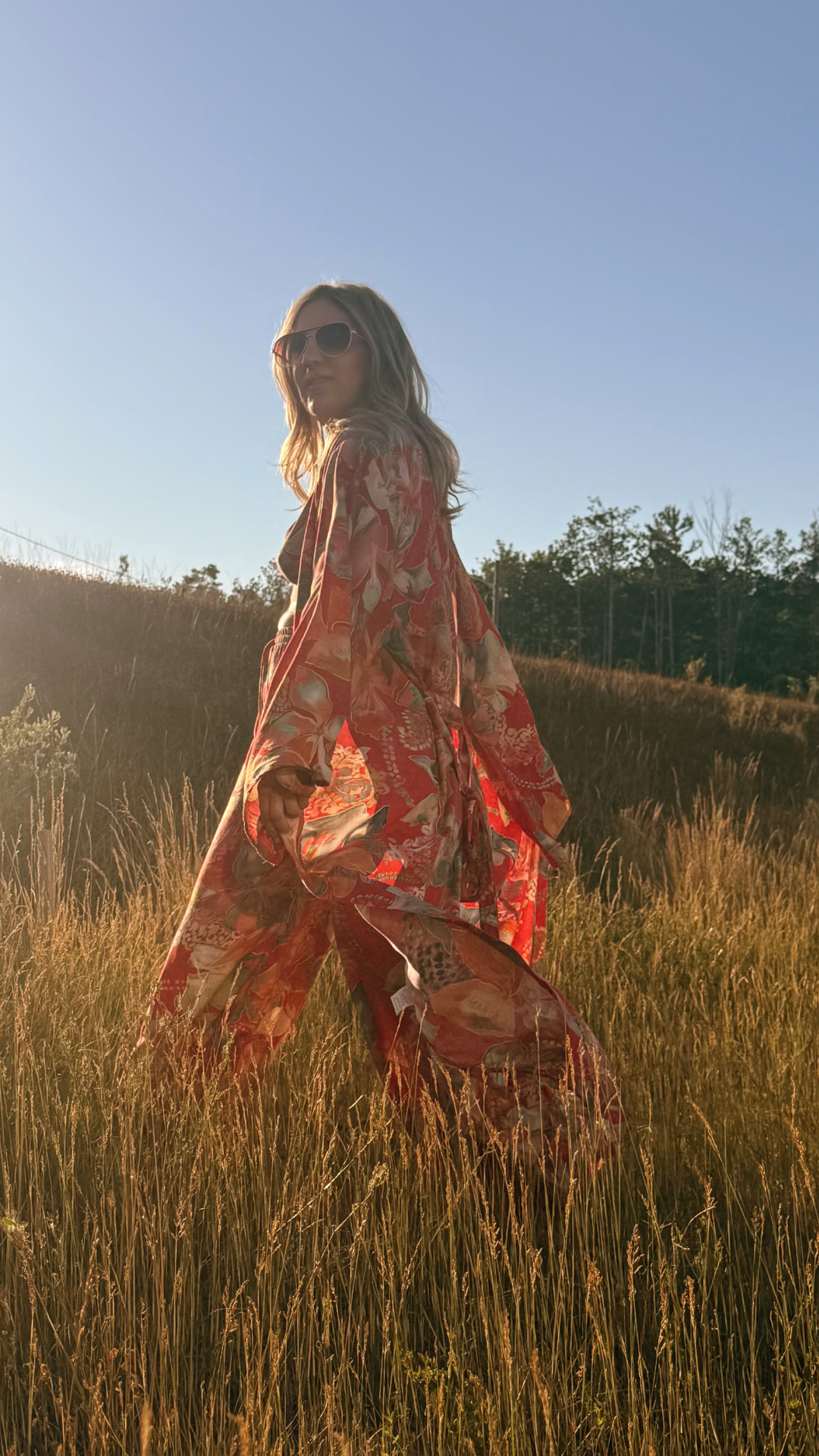 Refresh your bohemian wardrobe with the Maru Kimono—sustainably crafted from vegan bamboo rayon in a rich desert‑coral hue. Hand‑woven by fair‑trade artisans in India, this ethereal kimono features a painterly floral pattern in terracotta, cream, and soft gold metallic accents. Whether worn as a luxe beach cover‑up or layered over denim and tees, its lightweight, breathable drape brings effortless desert‑chic flair to every look.