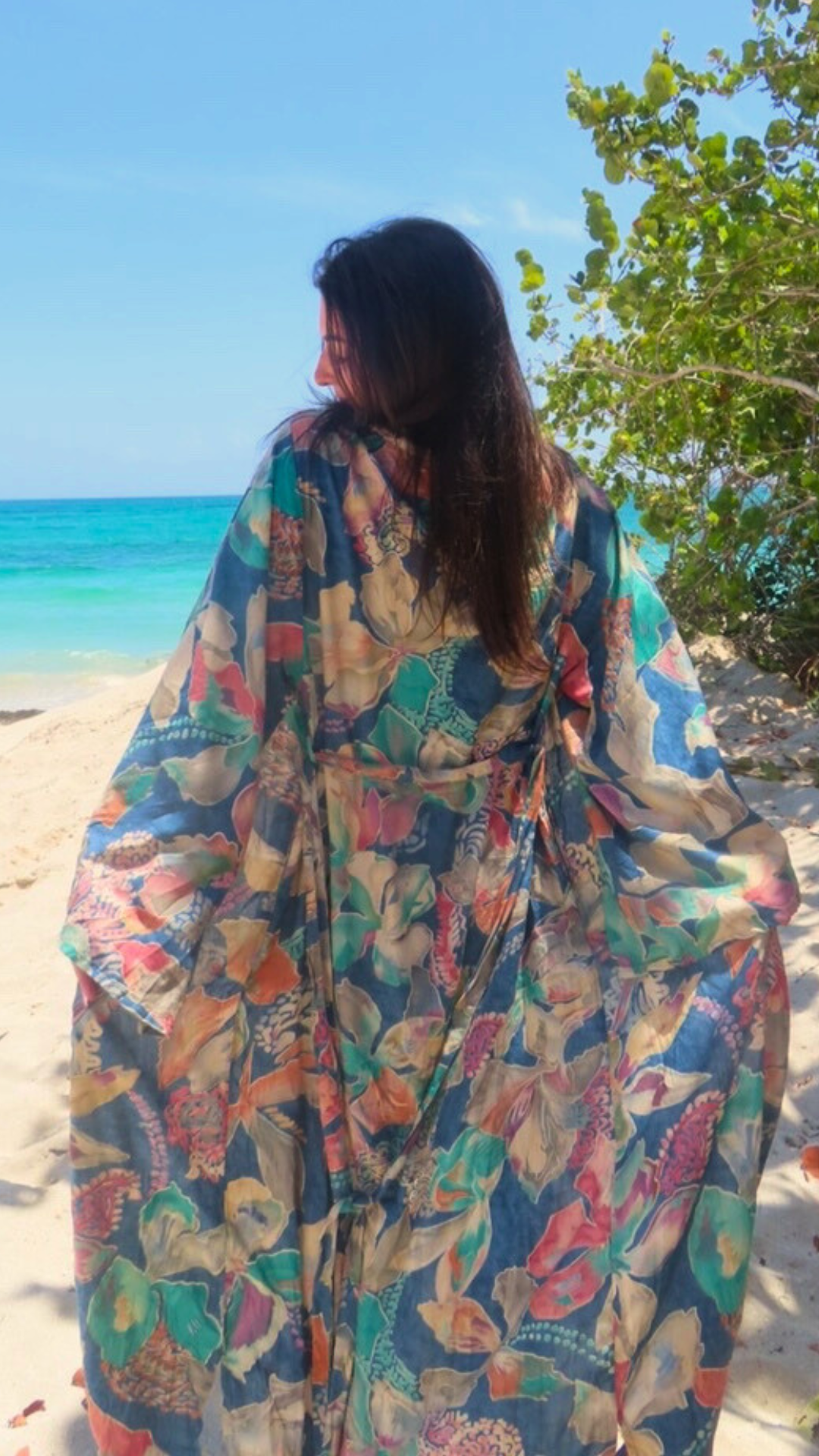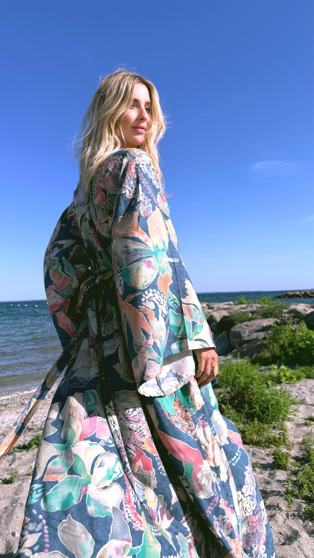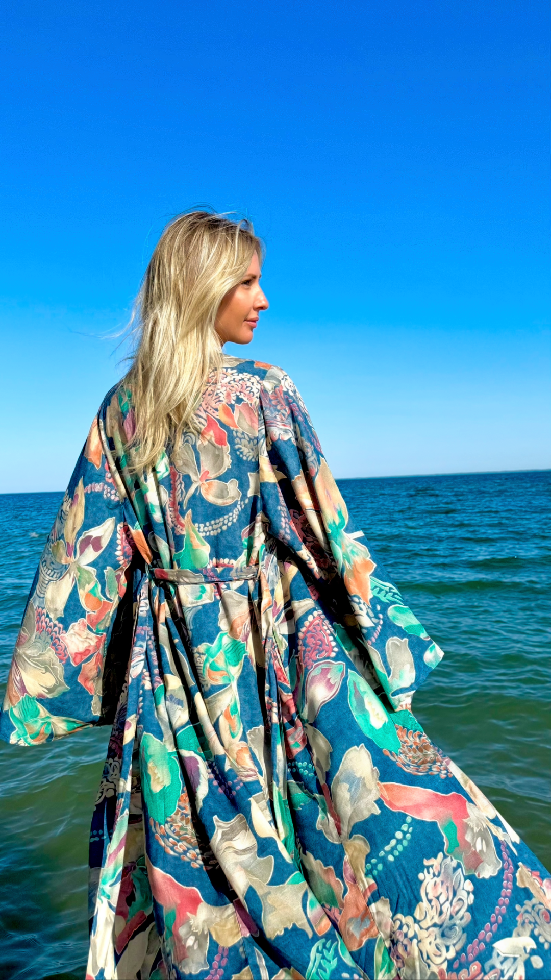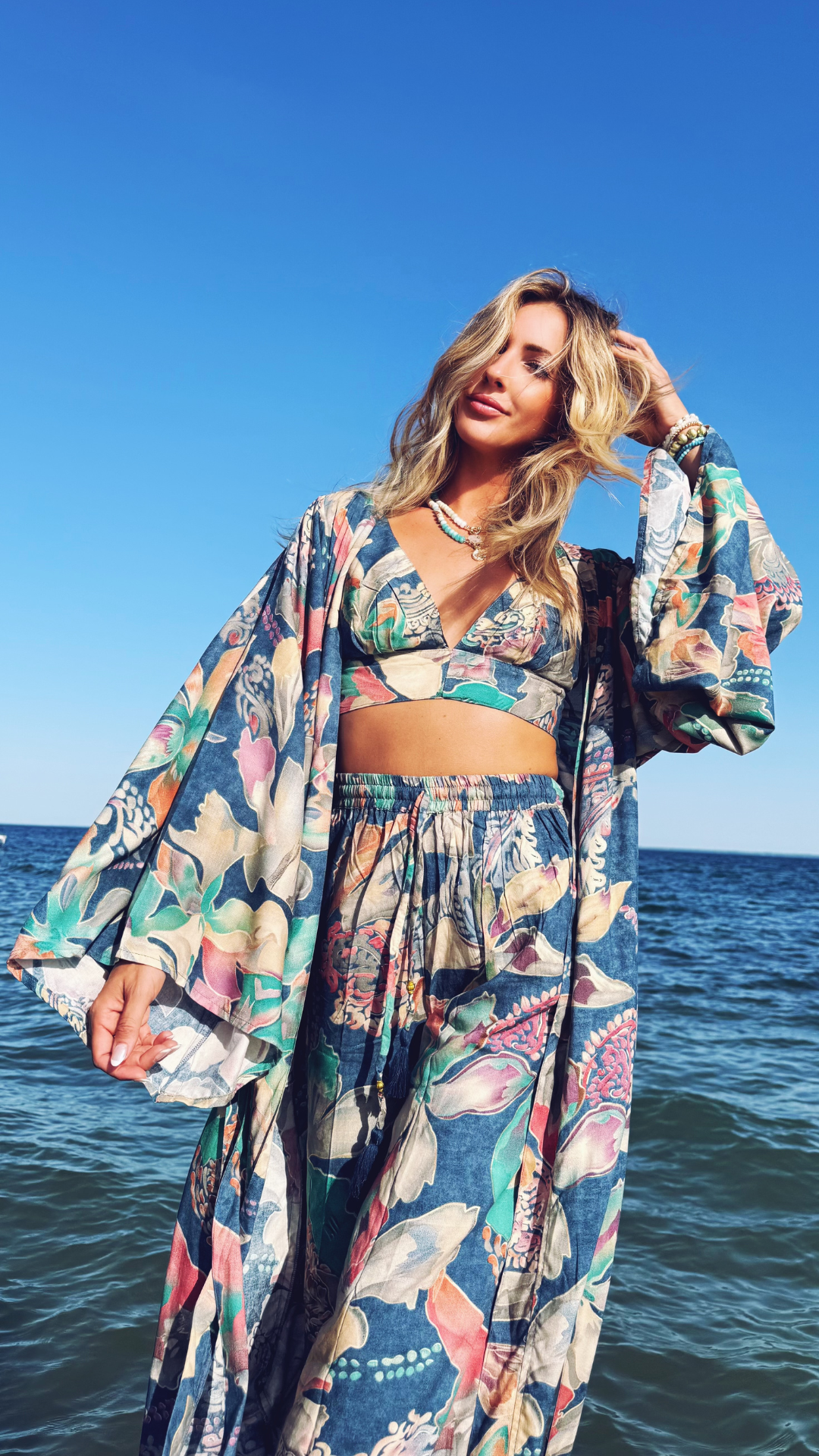 Elevate your boho wardrobe with the Mira Kimono, a sustainable bamboo rayon kimono crafted for eco‑conscious style. Hand‑woven by fair‑trade artisans in India, this lightweight bohemian kimono features a vibrant, painterly floral print on a deep ocean‑blue base, accented with soft gold metallic edging. Perfect as a beach cover‑up or layered over jeans and tees, this breathable, vegan kimono delivers effortless drape and versatile flair you can cherish season after season.
