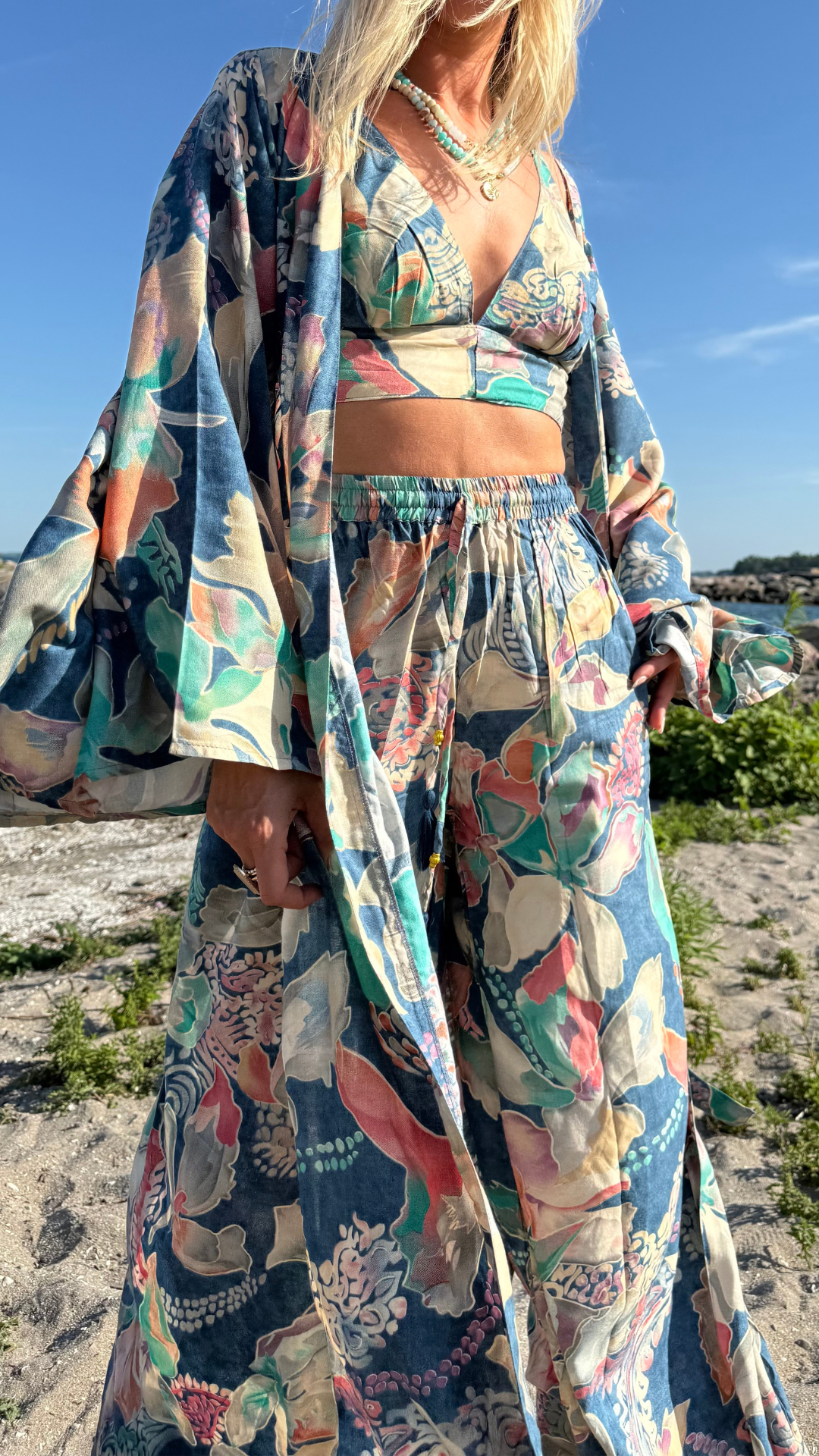 Mix & Match: Pair the Mira Pants with your Mira Kimono and Triangle Top for a full‑set boho look, or style them solo with a cropped tee, breezy off‑shoulder blouse, or fitted bodysuit. Finish with sandals and layered jewelry for festival flair or slip on sneakers and a vintage tee for laid‑back weekend vibes.