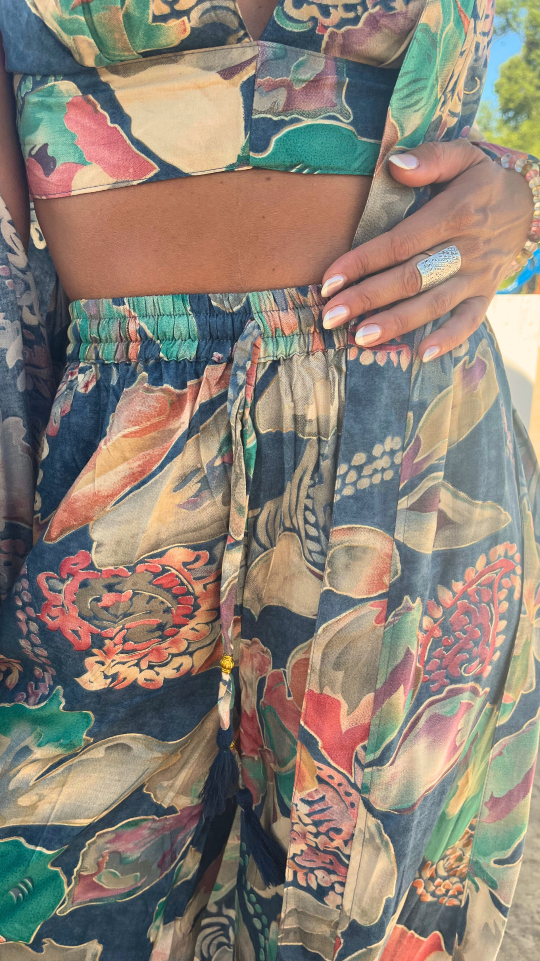 Crafted from 100 % vegan bamboo rayon, the Mira Pants feature a relaxed wide‑leg cut that flows with every step. Lovingly hand‑woven by fair‑trade artisans in India, they showcase a vibrant painterly floral pattern on a deep indigo canvas, kissed with subtle gold‑trim accents. The elastic high waist offers all‑day ease, while the lightweight, breathable fabric keeps you cool from beachside strolls to festival adventures. Pair them with a simple tee or layer under the Mira Kimono for a look that’s effortlessly bohemian and endlessly sustainable.
