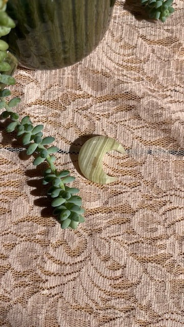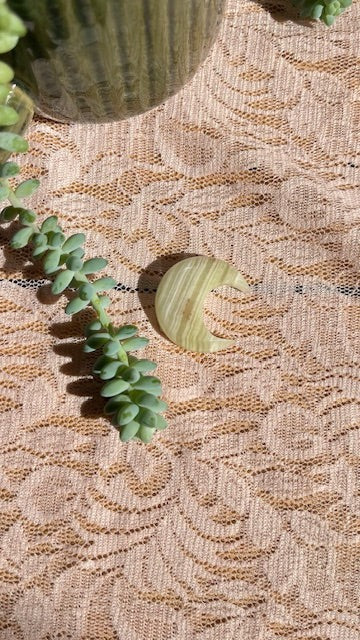 Bring a touch of sophistication and protection to your home with our Onyx Moon. This captivating gemstone, carved into a graceful crescent moon shape, showcases the deep, glossy green and white sheen of onyx, making it a stunning addition to any crystal collection or home decor.